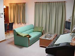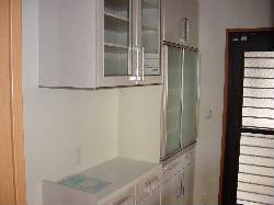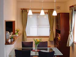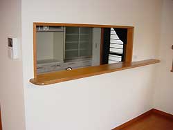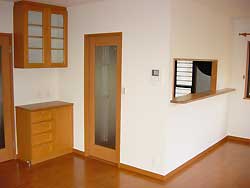 LD内に独立式のキッチンを設置。ロビングの入口には作り付けのリビングボードを設置。コンセント・電話端子・LAN端子を配置