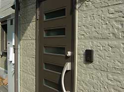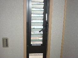 玄関扉はトステム製。採光を多く取り込めるデザインです。取手はムーンタイプで開閉が容易。※断熱仕様ではありません。
