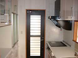 キッチンはIHテーブルとIH専用換気扇、一体型浄水器等と設置。勝手口は上下開閉式の扉です。