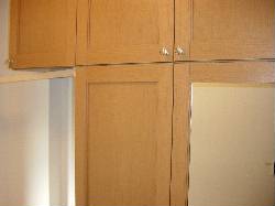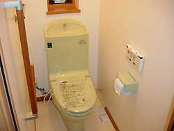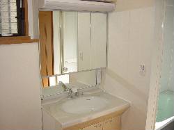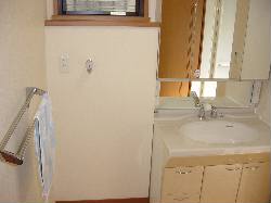 洗面台は松下電工製。作り付けの吊戸棚を設置し収納力をアップ。