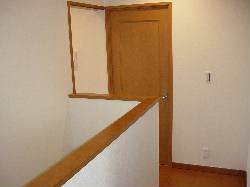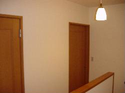 階段を取り囲むように部屋の扉が並びます。ペンダントライトのやさしい光がホールを照らします。