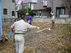 | 本日、基礎工事の準備として測量が行われました。地縄を張った際にも測量を行いましたが先日の地盤補強もありましたので、改めての測量です。建物の基礎になりますので図面を見ながら測量していきます。建物の面積はそれ程でもないのですが、こうして見ると敷地一杯に計画してしまったなと感じますね。特に北側と西側はお隣との境界が近く、人一人通れるくらいの余裕しかありません。このクリアランスでどうやって足場を組んで作業進めていくのか興味深いですね。 |