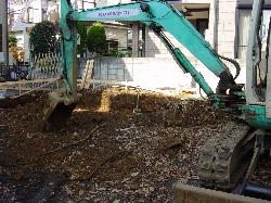 | 本日、敷地内の掘削工事が行われました。少し傾斜がありますのでフラットに削り出します。その過程で先日RES-P工法で打ち込まれたRESの頭も見えました。掘削にはパワーシャベルが使われ短時間であっという間にきれいになりました。以外と残土もでましたね。掘り返されたたが土と一緒に、笹の根が多いのには驚きました。土手から伸びてきたようですが凄い量ですね。 |