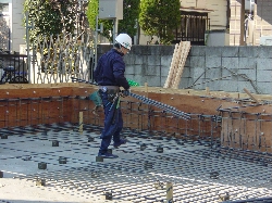 鉄筋は地面に直接置かず、地面から60mm以上離れていることが必要です。(かぶり厚60mm以上)また鉄筋の重なりは300mm以上あることが必要です。(建築基準法より)