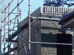 今日は、昨日行われたノッチモール(飾りブロック)設置の仕上げ工事が行われました。職人さん二人でモルタルの仕上げ作業をしていました。