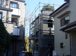 私道側から撮りました。2階建てですがお隣の3階建てと比べても結構な高さになりました。