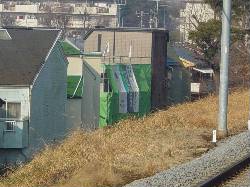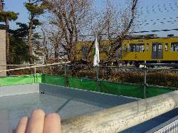 屋上で撮影中に電車が来ました。屋上よりも若干高い場所を電車が通過します。