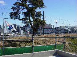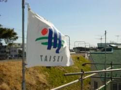 大成建設の旗がなびいております。奥の方に駅のホームが見えます。