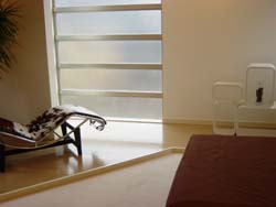 寝室です。大理石調のフロアと斜めにカットされたフローリングがこれまた良い感じでした。