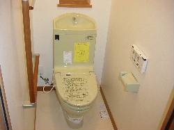 こちらは、1階トイレです。カラーはハーベストグリーンです。オールインワン(こんな言い方はしませんね)でウォシュレット一体型でスイッチは手元の壁に配置されています。2階も同様の仕様です。一応手摺をつけました。
