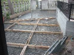 本日コンクリートの下地部分の仕上げと鉄筋張りが行われました。基礎工事以来、久々に鉄筋が張られた現場を見て興奮してしまいました。その他、木枠を敷いて溝を作ります。当初の仕様では、曲線状に樹脂の洗い出しを入れる予定でしたが、四角い家には四角いデザインが良いと思いまして、格子状に溝を入れその中に草やカラーストーンなどを入れて仕上げることにしました。コンクリートの我が家には、こちらの方か合っていると思い、最後の最後で変更しました。ちなみに先月大阪に出張した際に見に行った「大成建設 なんば展示場」を参考にしました。