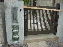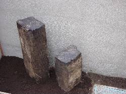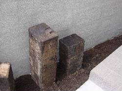 本日、門柱の仕上げと枕木の設置作業が行なわれました。打放しの門柱の中に仕込まれた縦型ポストとガラスブロックの周りもモルタルできっちり仕上げがなされました。枕木もアプローチ脇に立てられコンクリートと程よくあってなかなかのものです。