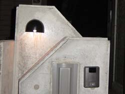 本日、門柱にインターホンと門灯が設置されました。夜暗くなってから撮影しましたが、やわらかい明かりがちょうど良い感じです。写真だとわかりにくいのですが、光がガラスブロックまで通じていてなかなか幻想的です。当初、手前と奥のコンクリートの門柱の間に、ライトを仕込み下からガラスブロックを照らす予定でしたが、明かりが分散してしまうのと、ご近所に迷惑かなと思いまして、表札の入る場所にライトを移動させました。
