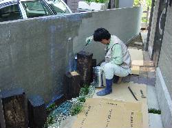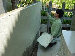 本日、外壁にジョリパットが塗られました。色は建物と同じで淡いグリーンであります。こて塗りで仕上げられたことで一段とアプローチ付近が栄えました。残すは表札の設置のみです。