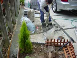 大活躍の父です。基礎用のコンクリートは砂利3、砂2、セメント1の割合です。(注)私ももちろん作業をしました。