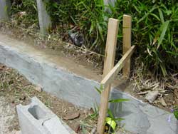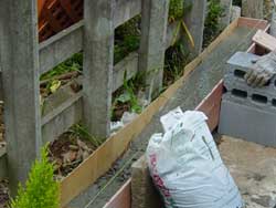 釘でとめた型枠をコンクリートを流し込み、更にブロックを使って補強しました。