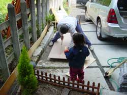 父が型枠用の板を切っているところに、娘が応援に来ました。孫と父の微笑ましい姿です。