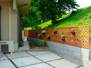 土留めフェンスづくりの最終日です。今日は基礎の段差や型枠跡をモルタルで仕上げました。作業は午前中で終わり無事フェンスが完成しました。土留め用の基礎部分はコテ仕上げにしてみました。またこれまで縦置きしていたラティス(120×90)を横置きに変えて設置したところ、東側全てにラティスを設置することが出来き見栄えも良くなりました。