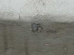 年末、屋上の落ち葉拾いをしていたところ、飾りブロック(ノッチモール)の接合部分の防水が剥がれている箇所を発見しました。僅かですが下地のメッシュ部分も見えています。この剥がれ方を見ると何かで擦ってしまったようです。落ち葉を拾っている最中に自分で傷をつけてしまったんですかね?まいったなぁ〜。