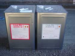 防水材はパンレタン防水(ウレタン塗膜防水)の主剤と硬化剤を2対1で配合します。