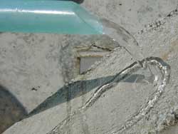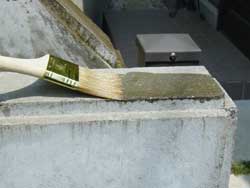作業はアクアシールを容器に移し、ハケを使って塗って行きました。打放しに直に塗っているそばからどんどんコンクリートに染み込んでいきます。作業は非常に簡単で、ムラがないように注意して塗るだけです。