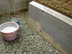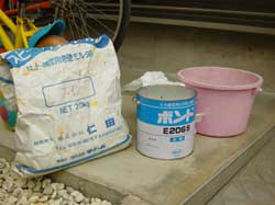 準備した材料は、主にコンクリートの補修用として使われる低粘度形エポキシ樹脂と急硬モルタルと水です。エポキシ樹脂を水で1対1に割りそこにモルタルを混ぜ合わせます。細かなピンホールやヘアクラックを埋めることができ、かつ撥水、防水性をも備えた樹脂配合モルタルですので我が家のような打放しの基礎には最適の塗料ではないかと思います。