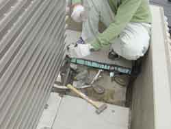 本日その補修作業が行なわれました。作業は大成のアフターの方、中央建材さんら3名の方で対応して頂きました。内容としては亀裂の入った台座を取り除き、新しい台座に交換し、モルタルで固定するまでの作業でした。残りのコーキングは次回になります。