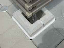 その後、新しい断熱ブロックを敷き、逃げを確保するために2分割した台座を配置しました。断熱ブロックは、断熱材の影響を考慮し水性系の接着剤で固定。一方で台座はエポキシの混合のコンクリート用接着剤でしっかり固定されました。逃げの部分にバックアップ材を入れ、最後に手摺の支柱をモルタルで埋めて固定し作業が完了しました。丁寧な作業ありがとうございました。