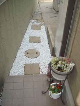 家が完成して5年目も経ちますので、アプローチの玉砂利もかなり汚くなりました。また、玉砂利そのものが下地の土に埋まってきていました。そこで今回、現在敷いている玉砂利を一度取り除き、下地用として普通の安い砂利を敷き詰め、その上から玉砂利を敷きなおしました。その後、真新しい真っ白な玉砂利を厚目に敷きました。