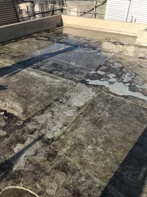 断熱ブロックを撤去し、防水層の状態を確認していきます。傷んだ箇所はカットしながら下地の処理をしていきます。ノッチモールの雨樋部分で防水層の厚みを確認することができましたが、5mm以上あり防水層だけでも結構な厚みがあるのですね。防水材の一斗缶が30個近く屋上に上げられてありましたので、容量からすると500L以上になりますので厚みも納得です。