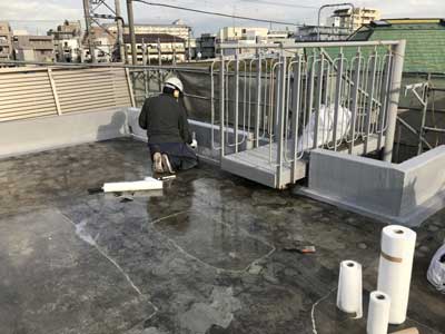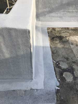 プライマーを塗り、ウレタン防水、その上にメッシュのクロス、更にウレタン防水を重ねていきます。最終的に仕上げとしてトップコートを塗ることになると思いますが、ウレタン防水材の間にメッシュのクロスを敷くことで、地震等PC板の動きによる防水層の割れを防ぎ、またこのクロスによって厚みのある均一の防水層を形成することができるだと思います。