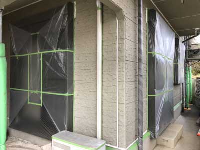 いよいよ週末から塗装作業が始まりますが、その下準備としてサッシ類、換気口、雨樋など養生シートが貼られました。外壁塗装はローラーで手作業となりますので大きく塗料が飛び跳ねることはないのですが、念のためお隣の車にも養生シートを貼らせて頂き万全の態勢を整えてもらいました。