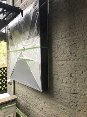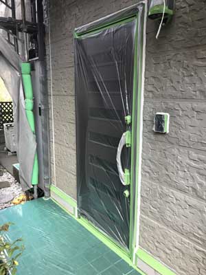 | 外壁塗装のにむけてサッシ類を中心に養生されました |