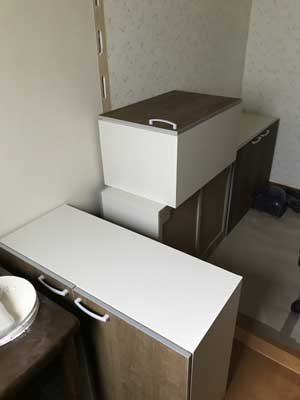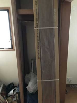 コンクリートの梁の部分を活用し、クローゼットを新設します。その他西側の壁面に設置する吊戸棚が届きました。当初、吊戸棚は大成さんからの発注でお願いしていましたが、見積り高く、自らネットを探して準備しました。吊戸棚の家具は高かったので、キッチン用の取り戸棚を準備しました。クローゼットの扉と同じデザインの木目調ものを選びました。施主支給のおかげでだいぶコストダンウンができました。