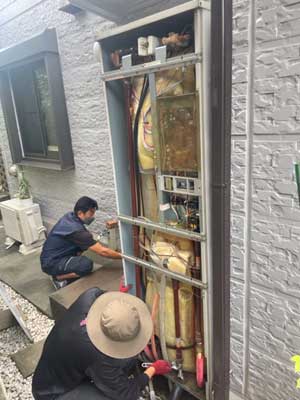 故障した温水器(左)を分解し、最新機種(右)に入替え