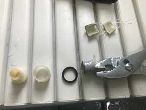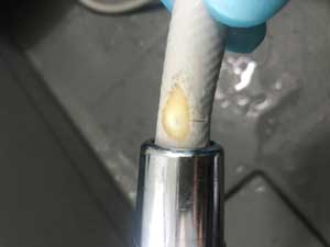 使い始めて20年も経過するとホースも固くなってしまいます。すり減った部分に硬化による亀裂が入ってしまい水が噴き出してしまうようになってしまいました。本来であればホースを交換しても良いのですが、ホース全体が傷んでいるわけではないので補修で凌ぐことにしました。