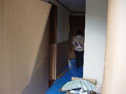 玄関・廊下の床と壁に保護シートが敷かれての搬出作業です。