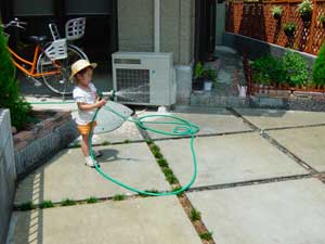 | 今週も暑い日が続いています。ついつい日中もエアコンに頼りがちですが、涼しい自然の風を求めて庭に水を撒いてみました。コンクリートの僅かなエリアですが水を撒くとだいぶ違います。窓を開けると涼しい風が室内に入ってきます。外から涼しい風が入ってきて風鈴の音色が響く・・・風情がありますね。だた、あっと言う間にコンクリートが乾いてしまうのが難点ですね。何度も水撒きをしていたらエアコンの電気代よりも水道代の方がかかりそうですね。 |