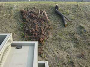 とにかく、この松のお陰で入居以来随分苦労させられました。なんせ松の葉が風で飛んできて屋上や庭に降り積もってしまうのです。しかも松の葉は細くて丈夫ですから、狭いところに入り込んで取り除きにくいったらありません。おまけに腐りにくいのでいつまでも残っています。これで今年の秋は楽ができそうです。