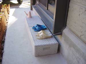 ここに台があるとないとでは我が家にとっては結構大きい問題なんですよね。というもの、車から荷物を降ろす際に、玄関よりもこの掃出し窓の方が近いので、直接ここから室内に荷物を搬出入が可能です。それと、娘が車の中で寝てしまったときなどは、ここから抱っこして布団まで運び込めますので重宝しています。何気ないモノですが、我が家には必要不可欠なモノですね。 |