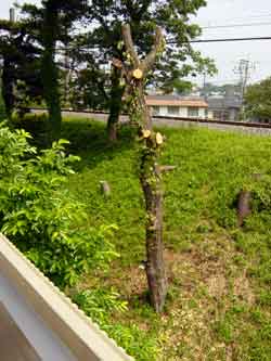 当日は線路の土手を管理している鉄道会社の委託業者の方数名で作業が行なわれました。最初は枝葉を剪定すると聞いていたので、どのくらい切ってくれるのか心配でしたが、見事にほとんどの枝葉を切り落としていきました。それから、昨年伐採して、幹や枝葉がそのままになっていた松の木も一緒に持っていってくれました。これで今年の秋は楽ができそうです。屋上の見晴らしも良くなりました。