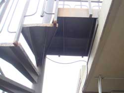 この雨垂れの原因は、PC手摺のちょうど上にある螺旋階段の赤錆部分から滴り落ちる赤茶けた雨です。