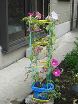 私も小学1年生の頃、同じように学校で朝顔を育てた記憶がありますが、その頃は朝咲いた花が昼には萎んでいたと思いますが、この朝顔、昼になっても花が萎みません。品種改良ものですかね。本当に力強いな〜。