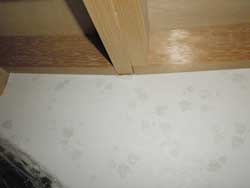 衣替えの季節になりました。先日ウォークインクローゼットを整理しようと思い、棚の上にあった使っていない鞄や布団類を引っ張り出したところ、なんと、棚の一部が凹んでいるではありませんか(右下写真)。その棚の下を見たところ、こちらは棚のズレによって壁紙が寄ってしまっています(左下写真)。