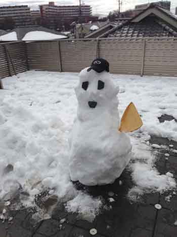 出来上がった雪だるま1体を除いて、余分な雪は屋上から花壇に作った雪置き場を目がけて落として作業終了となりました。