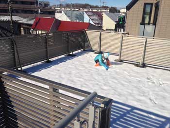 ということで、恒例のらせん階段に積もった雪かき作業を実施。ついでに屋上も雪かきを行いました。