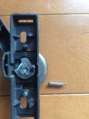 案の定、錠は結構なお値段。バネの破損ごときで錠ごと交換というのも、もったいないので、ステンレスの長めのバネがあるので、それを切断し自作してみようかと思います。