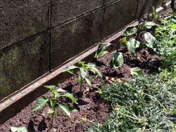 庭のブロック塀側の雑草を抜き取った後、土を掘り起こし肥料を撒いて軟らかい土壌を作り、そこにナス、ピーマン、きゅうり、ゴーヤの苗を植えました。