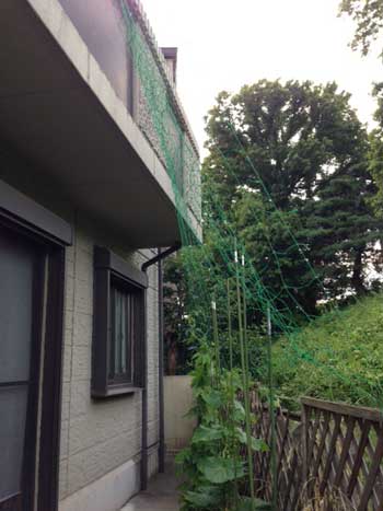 5月の連休に植えた野菜が順調に育ってきました。特に元気なのがゴーヤであります。一番奥に、他と比べると日当たりが良くない場所に植えたのですが、グングン伸びて、支柱の先端まで達しましたので先日ネットを張ることにしました。今年も大きく育ってくれると思いますが、手前に植えたきゅうりが今一つ元気がなく、ピーマンにいたっては苗木から2倍程度しか成長していません。隣のナスは既にいくつも実をつけているのですが。不思議なものですね。