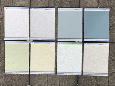 検討開始から丸2年。複数の会社から見積りを取るなど時間がかかりましたが、ようやく工事の日程が固まりました。11月中旬から工事に入りますが、塗料はエスケー化研さんの遮熱塗料を選びました。色については、カラーパレットを頂き、そこから選ぼうとしましたが、小さいパレットでは広い面積で見た時と比べて印象が変わってきてしまうので、サンプル版を作ってもらいまして、そこから選ぶことにしました。